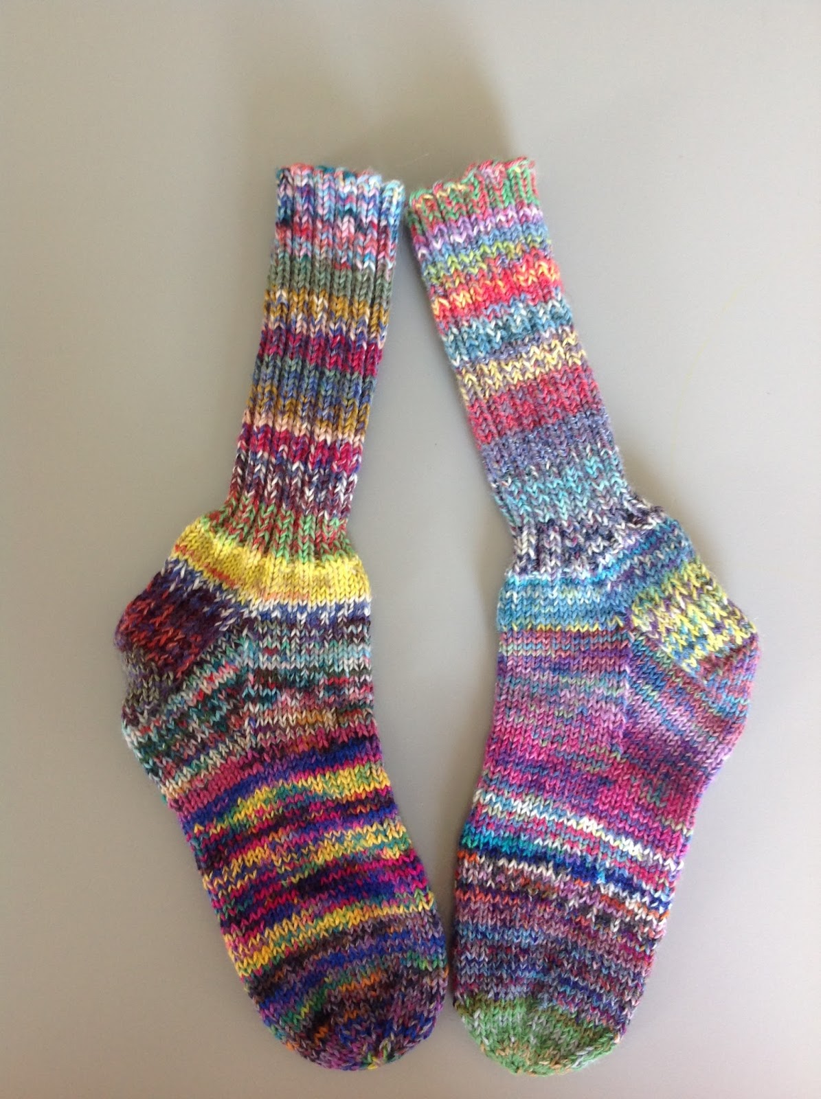 I often give small leftover balls of sock yarn to Christine P at knitting bee, most often they are to small for me to use in my patterns on socks, she doubled the yarn and made a pair of real Monstersocks. I have done a couple of pairs for a friends son but used bigger leftover balls, not so many ends to deal with.